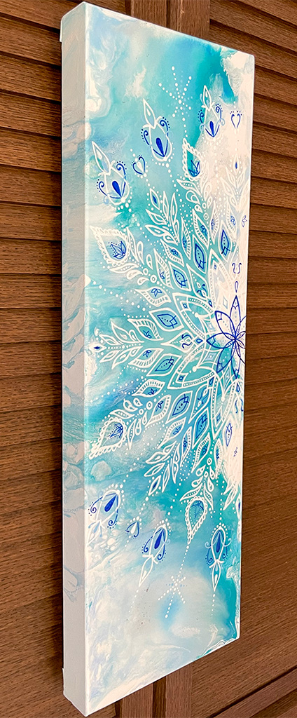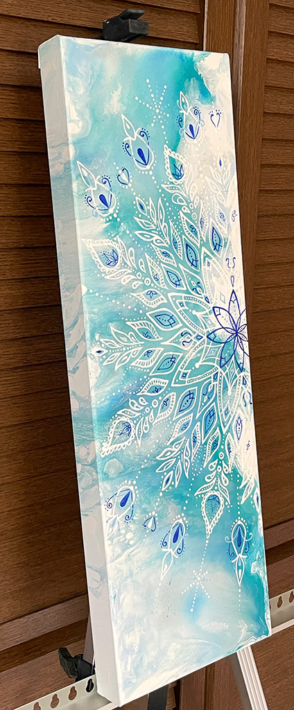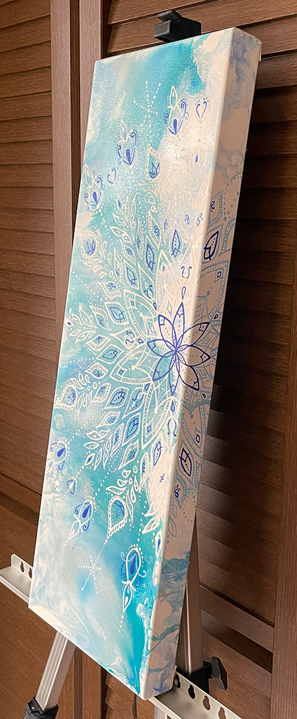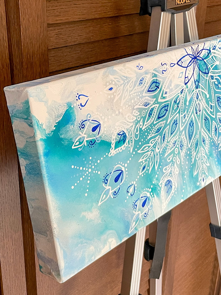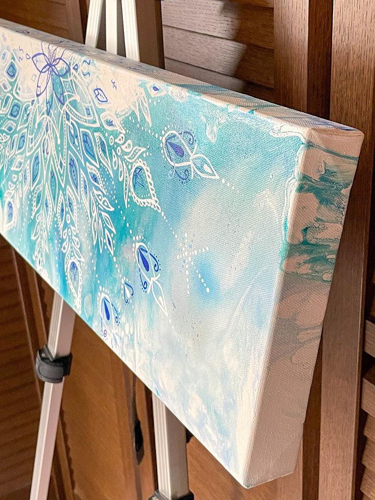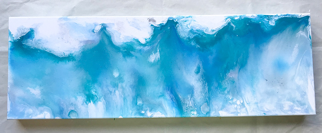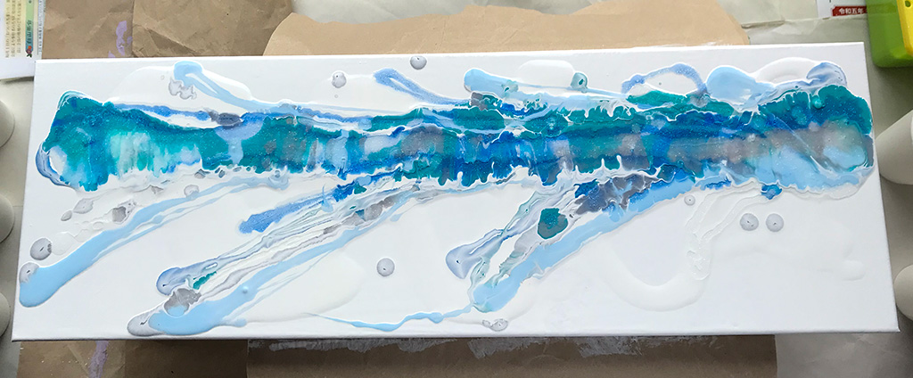 キャンバスを動かしたり、ドライヤーなどで風をあてたりして、絵の具を流して行くことで、こんな感じの不思議な模様が出来上がります